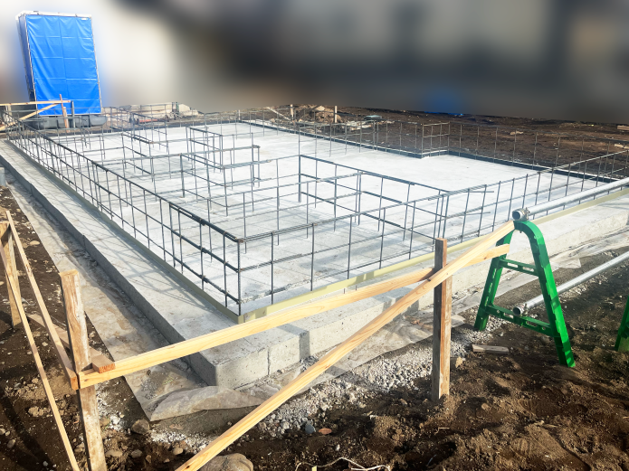 Q様の新築工事、下水や鉄筋基礎の作業が進んでいます。
